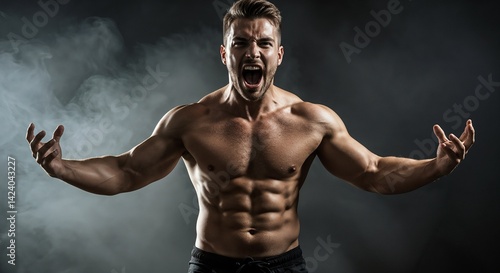 © schiers_images, Obraz premium A man poses shirtless, flexing his muscles, in a dynamic stance with clenched fists and a determined facial expression.