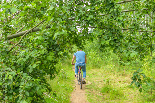 © Srg. Gushchin, Obraz premium A man rides a Bicycle along a forest path