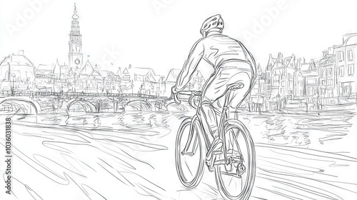 © Anna, Obraz premium A man rides a bike on a street beside a river, with a bridge and clock tower in the backdrop