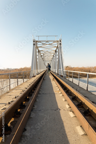 Fototapeta premium a man riding a bike on the train in the spring into the distance.