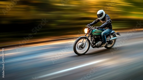 © zaheer, Fototapeta premium A man riding at full speed on a road, captured in a close-up shot with motion blur in the background, conveying a sense of speed and excitement during the daytime