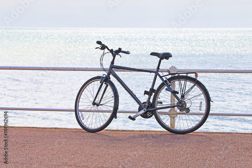 Fototapeta premium A man's bicycle propped against railings on the seafront with bright sea in...