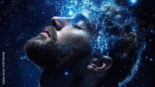 © Mrammon, Fototapeta premium A man's face is covered in glitter and is floating in space