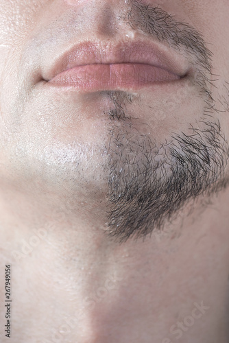 Obraz premium A man's half-shaved chin. White young man shaving.