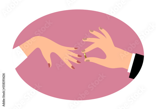 © Raman Maisei, Obraz premium A man's hand puts a ring on a woman's hand in an oval pink frame