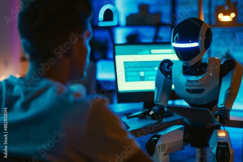© Svyatoslav Lypynskyy, Obraz premium A man sits at a desk, facing a glowing robot companion, as they work together on a project.