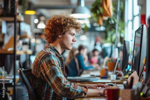 © koala studio, Obraz premium A man sits at a desk with a computer in front of him, focused on his work