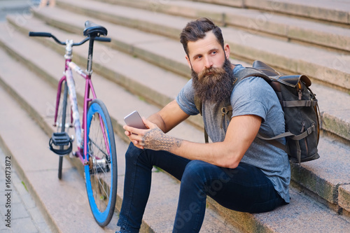 © Fxquadro, Obraz premium A man sits on a step and using a smartphone.
