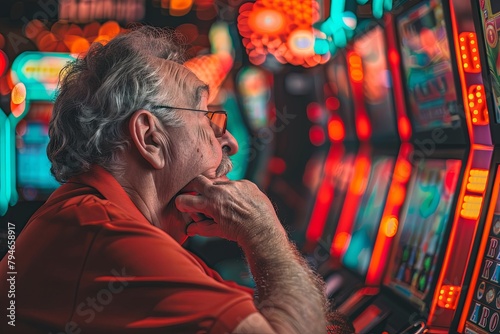Fototapeta premium A man sitting at a slot machine, pressing buttons and watching the reels spin...