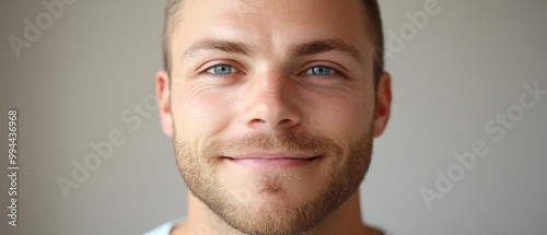 © Neural Pixels, Obraz premium A man smiles gently, showcasing his blue eyes and light beard in a well-lit indoor setting