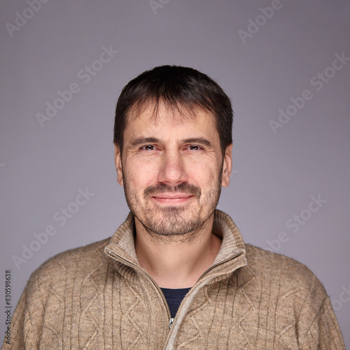 © justoomm, Fototapeta premium A man smiles warmly and confidently at the camera in a studio setting, radiating happiness and self-confidence.
