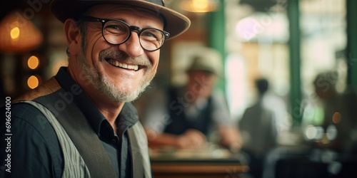 Fototapeta premium a man smiling and in a hat a man in glasses and vest, generative AI