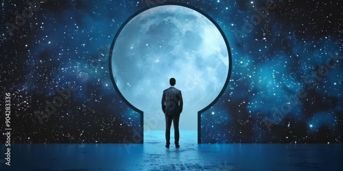 © YuDwi Studio, Fototapeta premium A Man Standing Before a Moon-Shaped Doorway