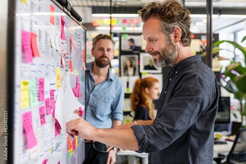 Fototapeta premium A man standing before a whiteboard adorned with sticky notes, deeply...