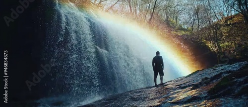 © raja, Obraz premium A Man Standing Beneath a Rainbow at a Waterfall