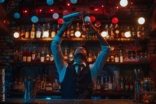 © Iftikhar alam, Fototapeta premium A man standing in front of a bar, holding a bottle in his hand, A bartender juggling bottles and shakers while making a drink