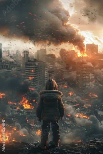 © Fotograf, Fototapeta premium A man standing on top of a roof with a fire in the background. Ideal for illustrating danger or emergency situations