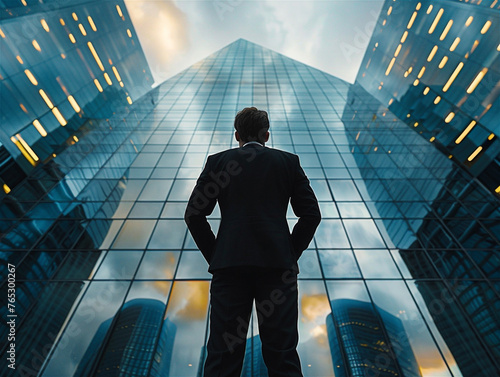 Obraz premium a man standing outside a tall state-of-the-art glass building.