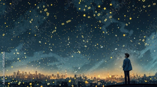 Obraz premium A man stands alone, looking up at a night sky filled with stars
