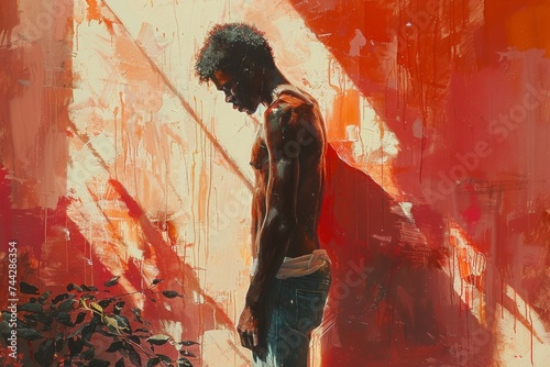 Obraz premium A man stands confidently before a bold red wall, adorned in splatters of...