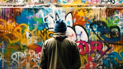 Fototapeta premium A man stands in front of a graffiti wall, generative AI.