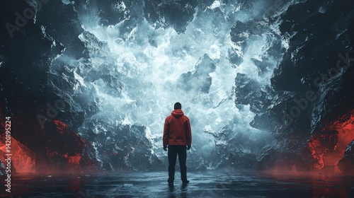 © Formoney, Obraz premium A man stands in front of a large, dark, and mysterious cave