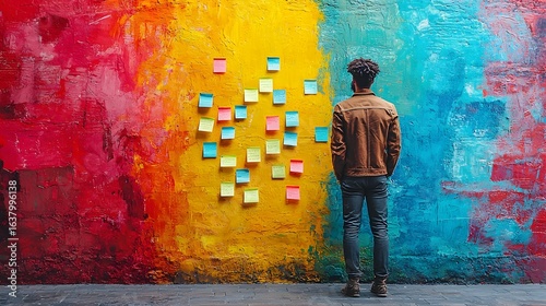 © Bussakon, Obraz premium A man stands in front of a vibrant colorful wall covered in digital notes