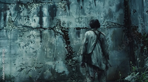 © Sarbinaz Mustafina, Obraz premium A man stands in front of a wall with graffiti on it. The man is wearing a white shirt and a black hat. The wall is covered in graffiti and he is old and worn. Scene is somewhat somber