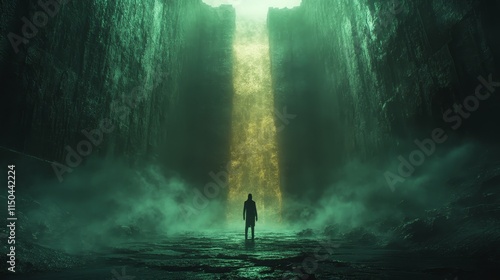 © Tyoma, Obraz premium A man stands in front of a waterfall in a dark cave