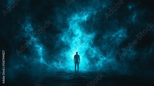 Fototapeta premium A man stands in the middle of a vast desert, facing the heavens with a bright light piercing through a dark sky, symbolizing hope, solitude, and the search for meaning