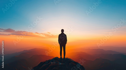 Fototapeta premium A man stands on a mountain top at sunset, looking out over the horizon