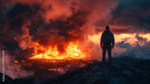 © liliyabatyrova, Obraz premium A man stands on a rocky hillside, looking at a large, fiery volcano