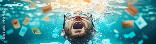 Fototapeta premium A man struggles underwater, surrounded by floating objects, capturing a moment of desperation and chaos in a creative setting.