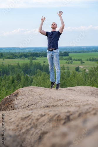 © Евгения Шолохова, Naklejka premium A man surrounded by mountains and forests. A man in a jump
