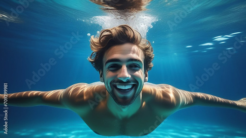 © OLGA RA, Fototapeta premium A man swims happy underwater in the pool.