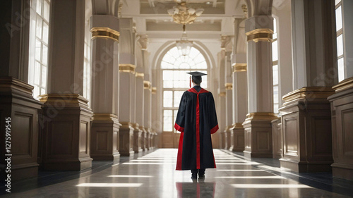 Naklejka premium A man, univesity graduate wearing graduation cap and gown is walking to...
