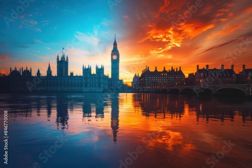 © itchaznong, Naklejka premium A man walks down a street in London at night