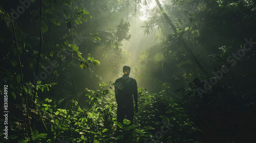 © brillianata, Fototapeta premium A man walks through a dark forest among trees and phenomena