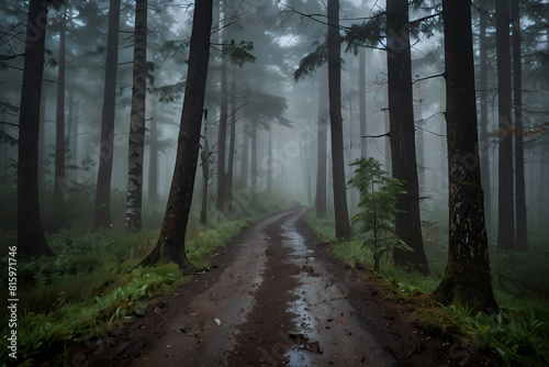 Obraz premium a man walks through a forest with a man walking on a path Veiled Vistas A Journey Through a Rainy