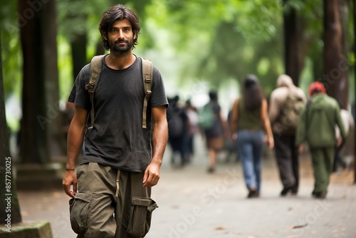 © MediaRaw, Fototapeta premium A man wearing a backpack and a shirt walks down a sidewalk