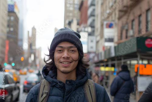 © MagnusCort, Fototapeta premium A man wearing a beanie and a hooded jacket smiles for the camera