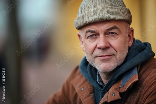 © Nataliia_Trushchenko, Fototapeta premium A man wearing a brown hat and a brown jacket is smiling. He is looking at the camera