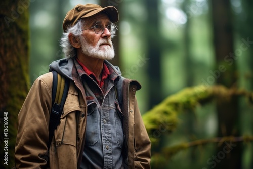 © MediaRaw, Fototapeta premium A man wearing a brown jacket and a hat is standing in a forest