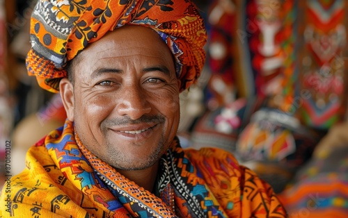 © imagineRbc, Fototapeta premium A man wearing a colorful scarf and turban is smiling. The scarf is multicolored and has a pattern of squares and circles