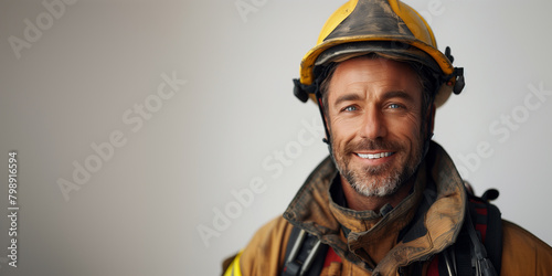 © alenagurenchuk, Fototapeta premium A man wearing a firemans helmet smiles on a white background banner