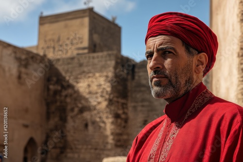 Naklejka premium A man wearing a red fez gazes thoughtfully while standing close to an ancient...