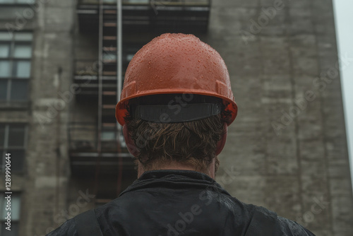 © jr-art, Obraz premium A man wearing a red hard hat is standing in front of a building
