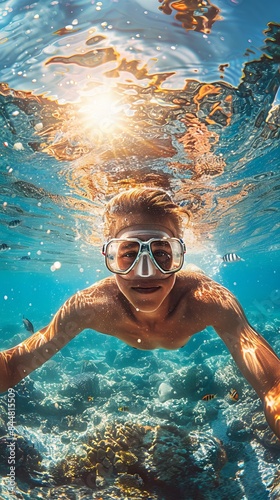 © Mary_muis/stoker ua, Fototapeta premium A man wearing a snorkeling mask takes a selfie underwater. The background shows the sun's rays breaking through the surface of the water.