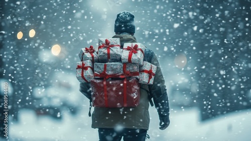 © Влад Герченов, Naklejka premium A man wearing a winter jacket, hat, and carrying a red backpack walks through the falling snow, carrying a stack of wrapped gifts with red ribbons.