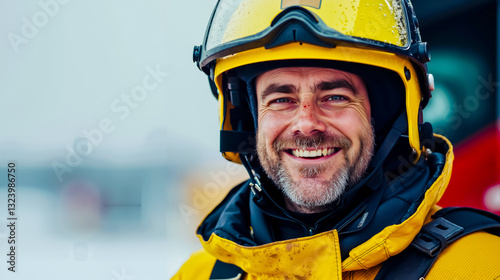 © Nikname, Fototapeta premium A man wearing a yellow helmet and goggles smiles at the camera